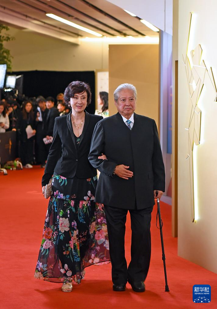 3月16日,第18届亚洲电影大奖评审主席洪金宝(右)在红毯亮相。新华社记者 陈铎 摄
