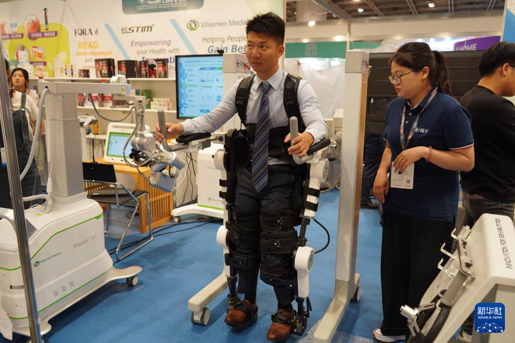 在第16届香港国际医疗及保健展上,工作人员穿戴外骨骼机器人进行操作演示(5月26日摄)。新华社发(郭辛摄)