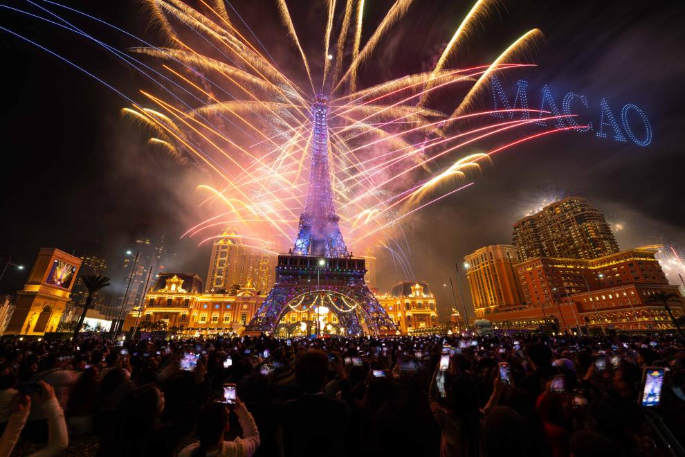 在路氹城金光大道,还有一群翘首以盼的人们,挤满了附近的广场和街巷。接近零时,灯光汇演和倒数烟花汇演在欢呼喝彩声中如约而至。当由无人机编队组成的倒计时数字在半空中闪烁,人们不禁跟着一起倒数:“3、2、1……”