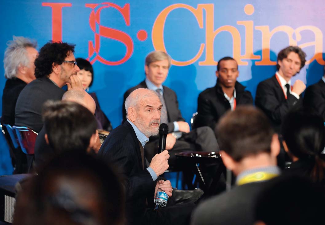 2011年11月17日,史景迁(中)在首届中美文化艺术论坛的新闻发布会上回答记者提问
