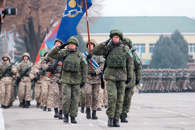 2022年1月13日,在哈萨克斯坦阿拉木图,集安组织维和部队在送行仪式上接受检阅