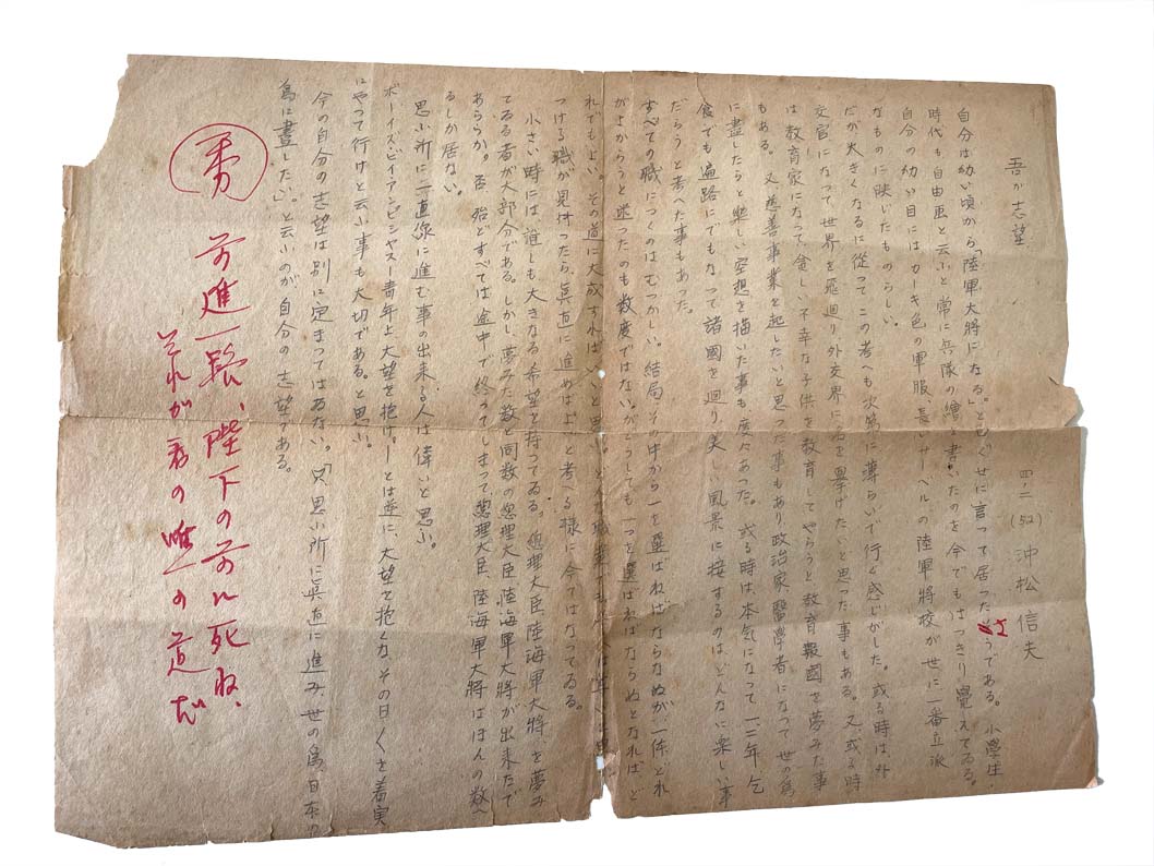 写这篇作文的时间是1940年,冲松信夫15岁。这篇文章总体说来写得情真意切,文笔流畅。老师用红笔给冲松信夫的作文评了“秀”,就是“优”的意思。但老师似乎又对冲松信夫作文中透露出的志向的不坚定非常不满,于是继续用红笔在“秀”字后面写了句评语:“勇往直前,死在陛下御前,这是你唯一的路!”