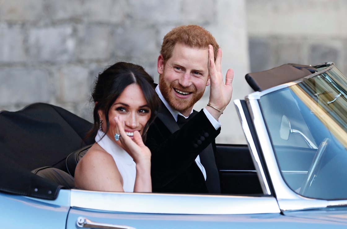 2018年5月19日,在英国温莎,哈里王子与妻子梅根在婚礼结束后乘车离开