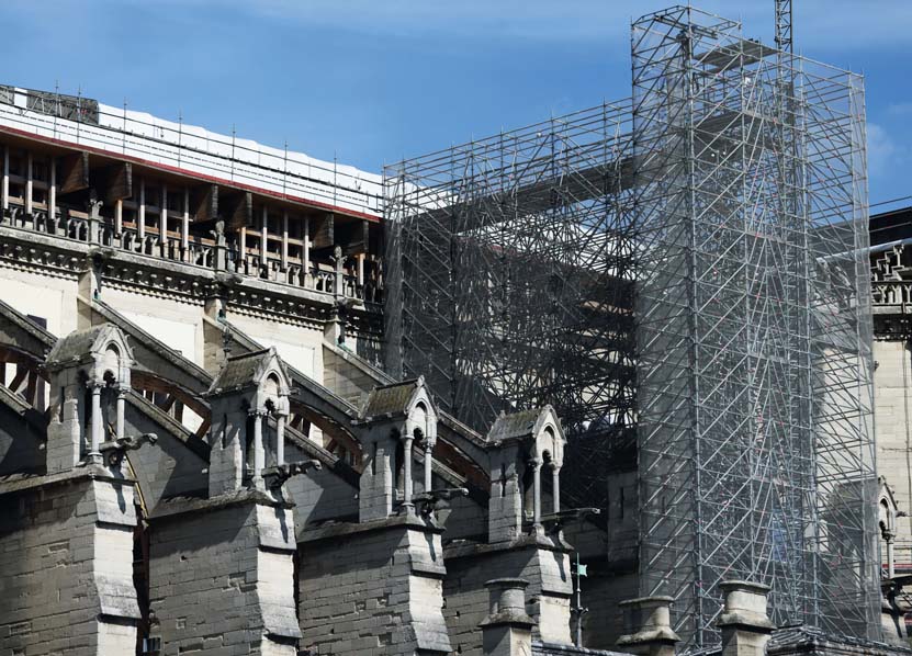 失火时巴黎圣母院周围搭设了大量金属脚手架。当时如果没有这些脚手架,建筑在大火中倒塌的部分会更多。然而,这些脚手架也成为修复过程中的棘手难题。一部分金属脚手架遇火熔化,一部分脚手架在高温下扭曲变形、悬置在屋顶上,不仅有坠落风险,也给整个建筑增加了额外压力。开始修复前,必须耗费大量人力清理。