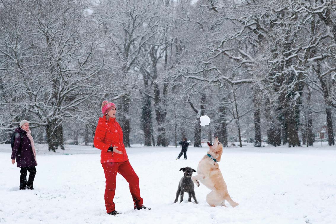 2021年1月24日,在英国哈特利温特尼,人们和宠物犬在雪中玩耍