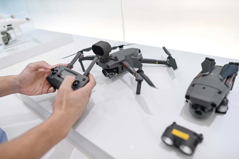 2021年9月27日,参观者在深圳市南山区大疆创新公司展厅体验无人机