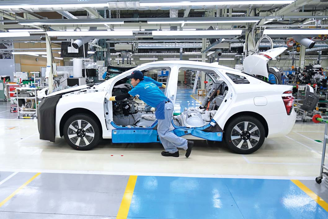 两名员工将丰田氢燃料电池车MIRAI 推向下一个工位