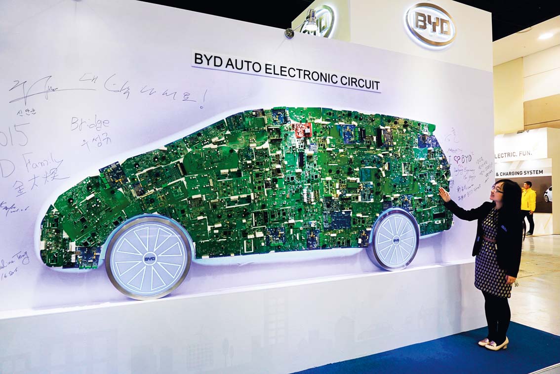 2015年3月6日,在韩国济州岛,比亚迪工作人员在第二届国际电动汽车展上介绍比亚迪的整车电路板