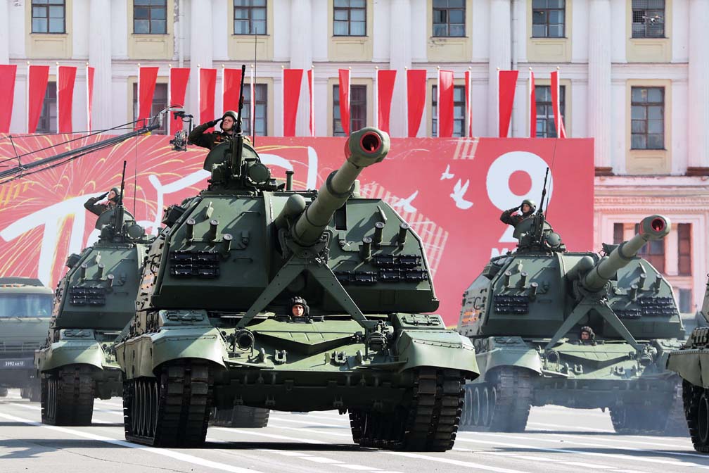 5月7日,自行火炮编队驶过俄罗斯圣彼得堡冬宫广场