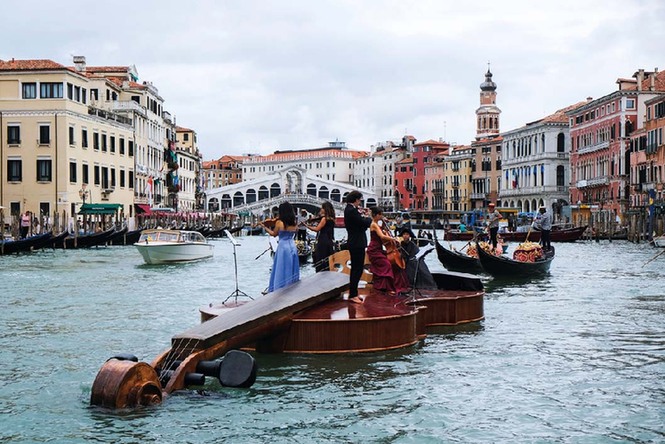 2021年9月18日,在意大利威尼斯,音乐家在一条小提琴形状的船上演奏乐曲