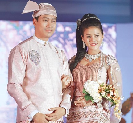 2018年10月14日,在缅甸仰光举行的婚礼博览会上,模特展示婚礼服饰