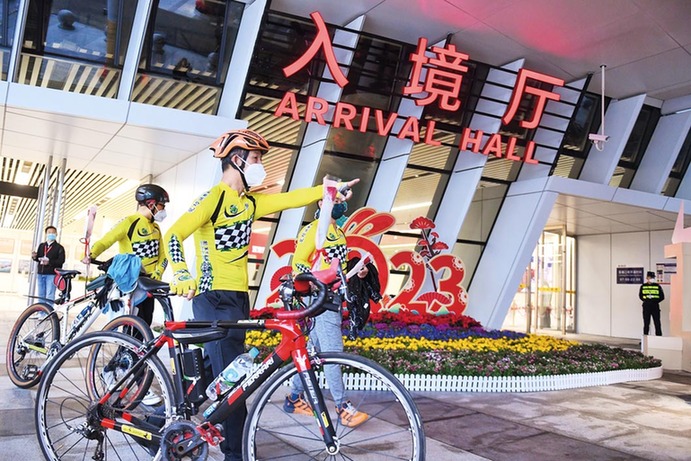 2月6日,在深圳莲塘口岸,龙坊俱乐部的香港骑行爱好者带着自行车入境
