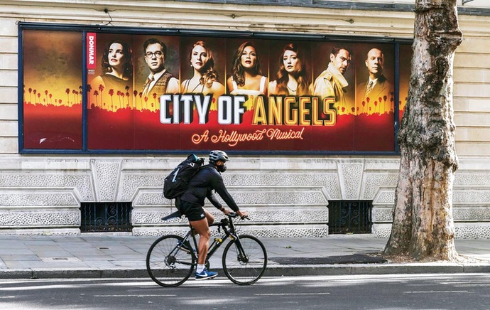 2020年9月28日,一名男子骑车从英国伦敦西区的音乐剧广告前经过