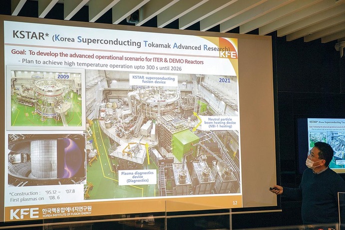 2022年1月10日,在韩国大田市韩国聚变能源研究所,KSTAR研究中心本部长尹时雨向媒体记者介绍超导核聚变研究成果
