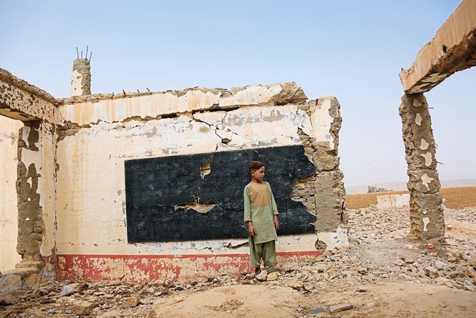 2022年8月23日,在阿富汗南部赫尔曼德省桑金地区,一名男孩站在废墟之中。