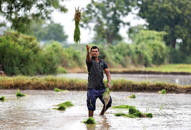 7月21日,在印度艾哈迈达巴德,农民在稻田里劳作