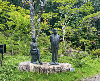 房屋外面是典型的日式庭院,种着樱花、枫树以及各种花草,小桥流水,曲径通幽,院里一棵粉色紫薇花开得正盛。树旁立着两座铜像,长谷川仁西装领带,背手挺身站立,目视庭院,妻子林子坐着,两手扶膝,面带笑容看着丈夫。