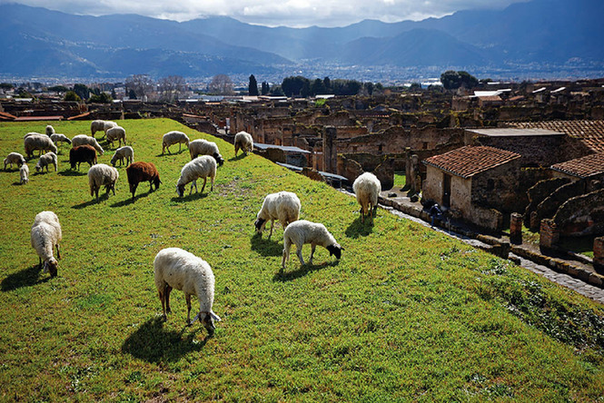 3月7日,羊群在意大利庞贝古城遗址吃草
