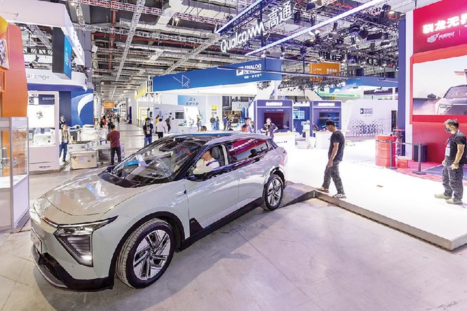 11月2日,一辆搭载高通芯片的智能电动汽车准备驶向第六届进博会高通展位