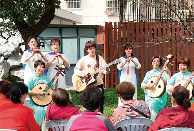 也为社区治理注入了活力。图为3月15日,“全音堂”音乐志愿服务队在吴兴区智慧养老服务中心为老人演出
