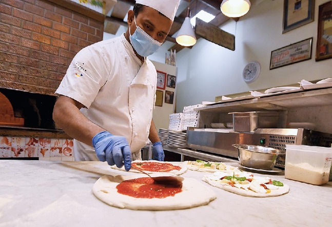 2020年4月24日,在意大利罗马,餐厅工作人员制作披萨