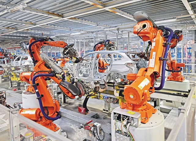 在华晨宝马沈阳铁西工厂车身车间,机器臂在焊接车身
