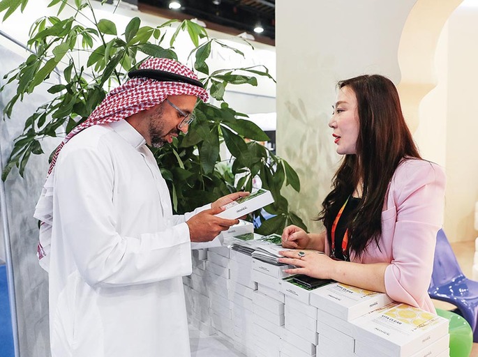参展商(右)在“2023辽宁国际美丽健康产业博览会”活动上介绍产品