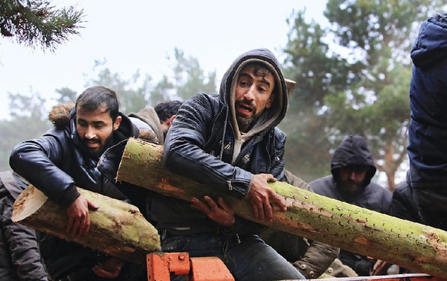 2021年11月14日,在白俄罗斯靠近波兰边境的难民点,人们搬运用于取暖的木材