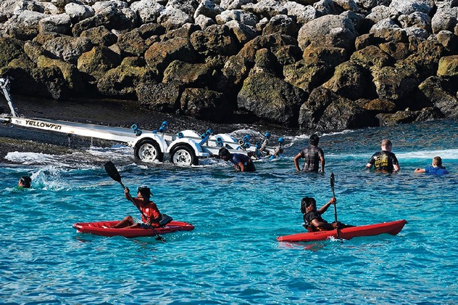 1月18日,在瑙鲁阿尼巴雷湾,人们在海面上戏水休闲