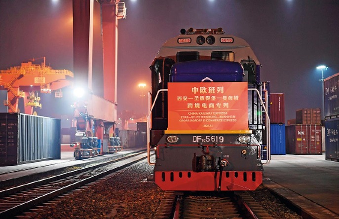 2021年12月31日晚,中欧班列长安号跨境电商专列在西安国际港站准备出发开往德国曼海姆