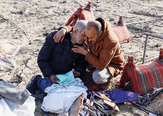 2月18日,在加沙地带南部城市拉法,人们在一处以军空袭废墟旁悲痛不已