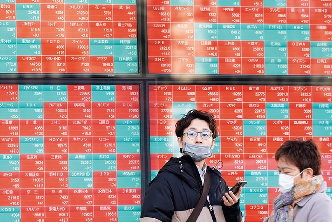 2月26日,行人站在日本东京街头的一块电子股指显示屏前
