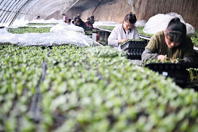 工作人员在宁夏银川市贺兰县天缘种业大棚内管护幼苗(2月22日摄)
