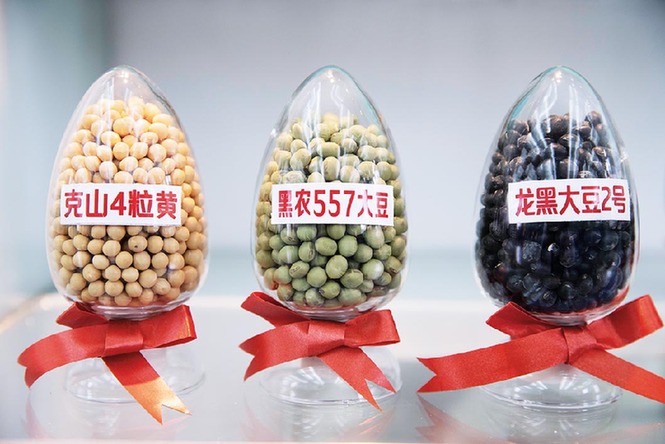 在黑龙江寒地作物种质资源库内展出的大豆种子(2022年5月19日摄)