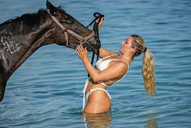 2022年8月22日,在巴巴多斯布里奇敦附近,游客与赛马在水中玩耍