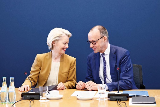 2月19日,欧盟委员会主席冯德莱恩(左)与德国基督教民主联盟(基民盟)主席默茨