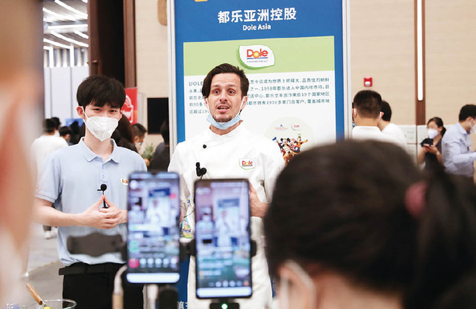 一名来自法国的美食主播在第五届进博会的对接会现场直播美食制作