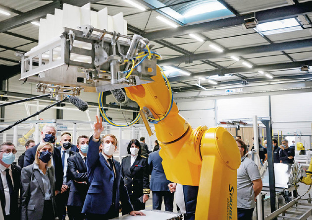2021年10月25日,法国总统马克龙(前)在圣埃蒂安市视察一家智能机器人公司