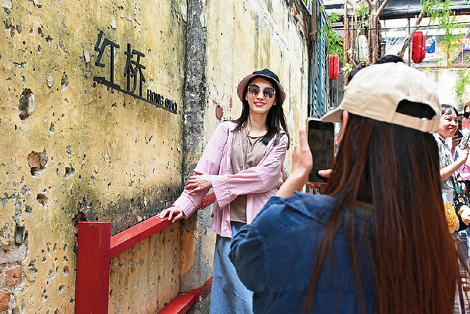 茨厂街附近的鬼仔巷内,游客与壁画合影