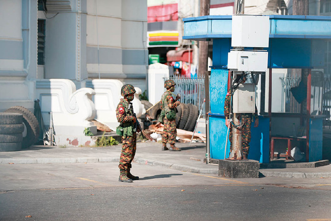 2021年2月2日,士兵在缅甸仰光市政大楼院内执勤