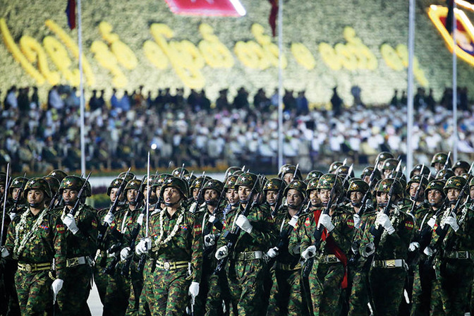 3月27日,士兵在缅甸内比都参加建军79 周年阅兵式
