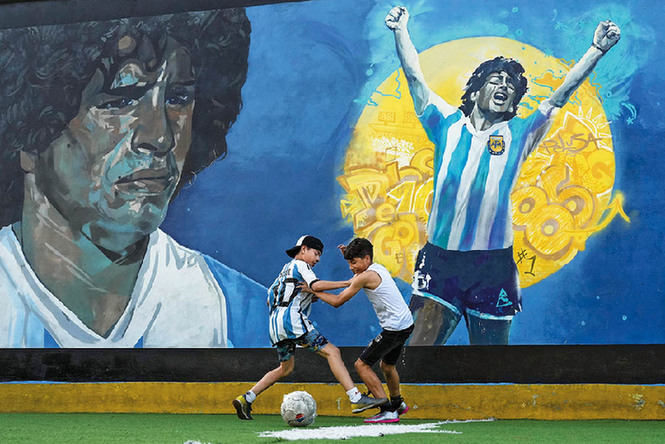 1月25日,在委内瑞拉卡拉沃沃州卡贝略港,两名男孩在一幅阿根廷球星马拉多纳的巨幅墙绘前踢足球