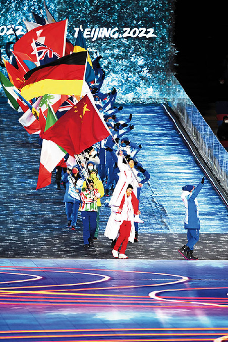 2022年2月20日晚,北京第二十四届冬季奥林匹克运动会闭幕式在国家体育场举行,这是代表团旗帜和运动员入场环节