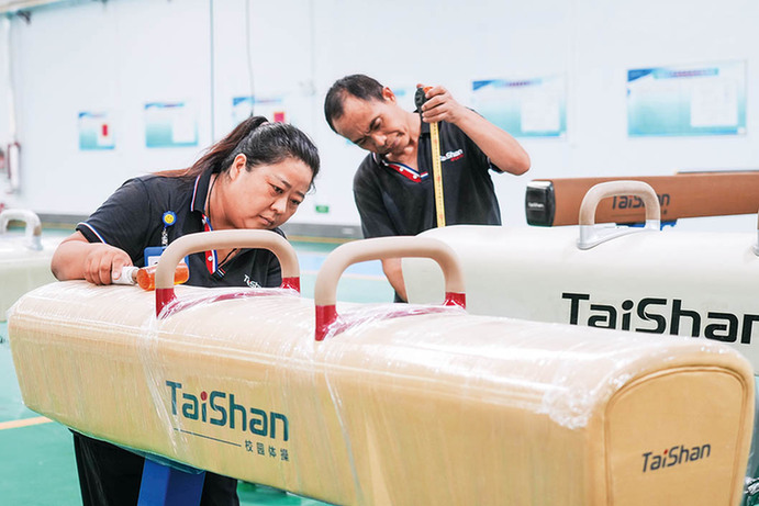 7月初,《环球》杂志记者在巴黎巧遇山东泰山体育的工作人员。这家公司派出了专业的技术团队,为摔跤、柔道、体操等多个比赛场地提供十几项安全可靠并充满科技智慧的体育器材。