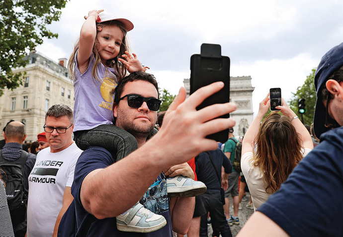 7月14日,在法国巴黎凯旋门附近,一对观看国庆节阅兵式飞行表演的父女与凯旋门自拍
