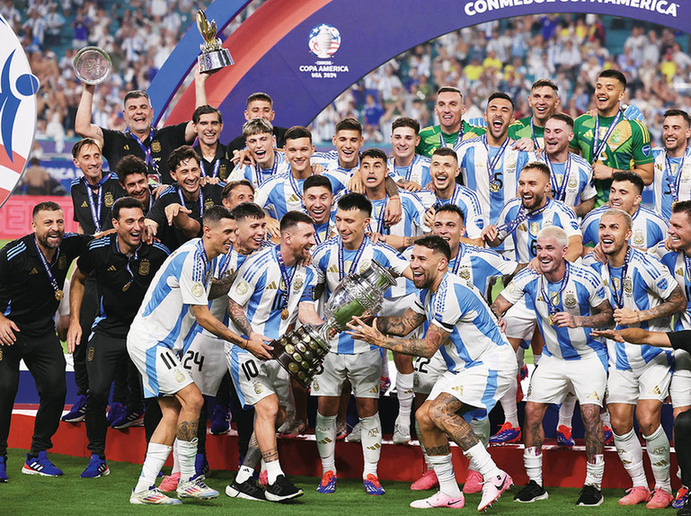7月14日,阿根廷队在颁奖仪式上庆祝夺冠