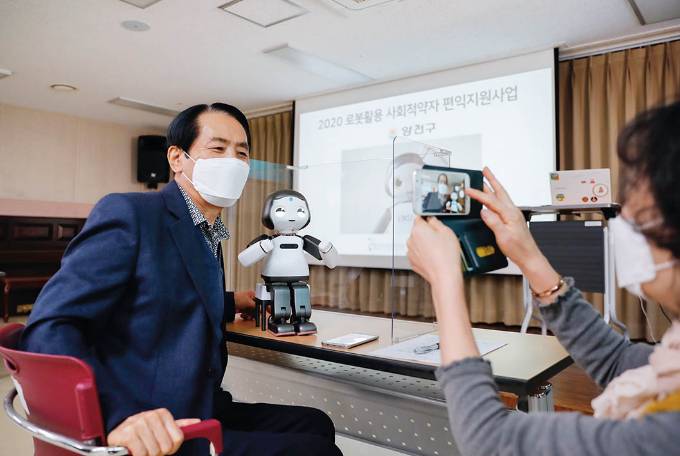 2020年11月16日,一名老人在韩国首尔阳川区一处老年福利文化中心和数码教学机器人“LIKU”学习结束后合影留念