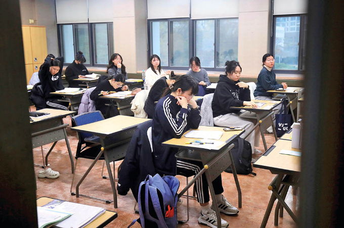 2023年11月16日,考生在韩国首尔的一处考点参加高考