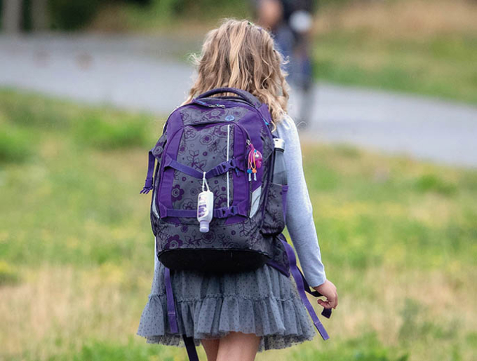 2020年8月17日,德国法兰克福一名学生的书包上挂着消毒剂