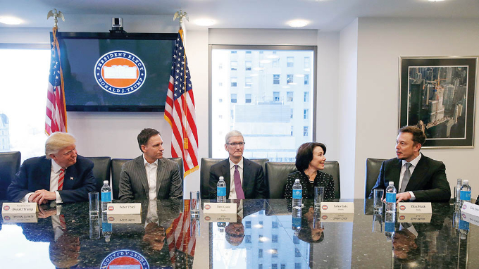 朗普大厦,(从左至右)特朗普、硅谷风险投资家彼得·蒂尔、苹果首席执行官蒂姆· 库克、